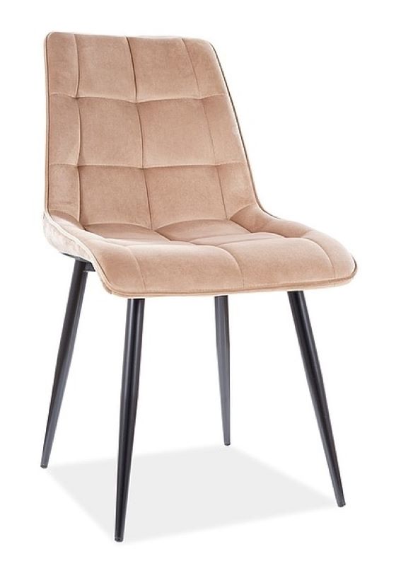 Krzesło do jadalni z wyściełanym siedziskiem i oparciem z tkaniny w kolorze beżowym. Stalowe nogi o wyglądzie ciemnego dębu.